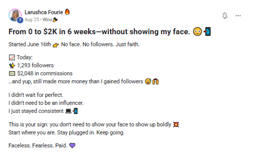 She made $2K in 6 weeks without showing her face because she dared to try this system that gave her the freedom to keep her work and personal life private!